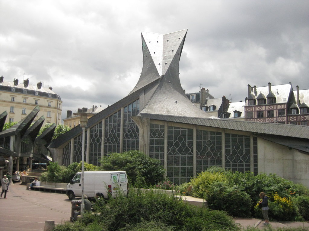 In Rouen: churches again. I have to admit, they look really impressive, but after the third city they are getting boring, because they all look the same. And cold and grey inside. It was a real relieve to visit the modern church „Jeanne d’Arc“, just next to the place where she was burned. A wooden roof, which makes a very warm atmosphere. The architecture of the buildings in Rouen already looks pretty different, many FACHWERKHAEUSER. A big historic centre, with cafes, shops and people (but hardly any ATMs).